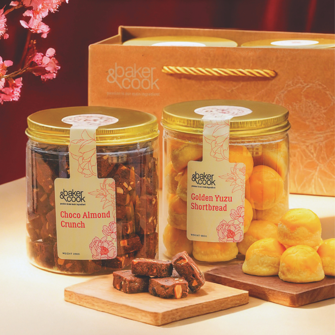 Includes a bottle of Golden Yuzu Shortbread and Choco Almond Crunch.